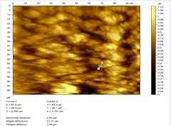 Площадь сканирования составляла от 1 до 50 мкм. Микроскопия проводилась на воздухе полуконтактным методом, на линиях регистрации изменения амплитуды колебаний оси противодействия отражены колебания промежуточного движения и рельеф поверхности, что свидетельствует об адгезии отдельных поверхностей друг к другу. На рисунке 1 показана поверхность полиэтилена, модифицированного фосфатами двухвалентного цинка. Результаты показывают, что шероховатость чистого полиэтилена составляет 100 нм, а шероховатость поверхности полиэтилена, модифицированного оксидом цинка, составляет 210 нм [11].