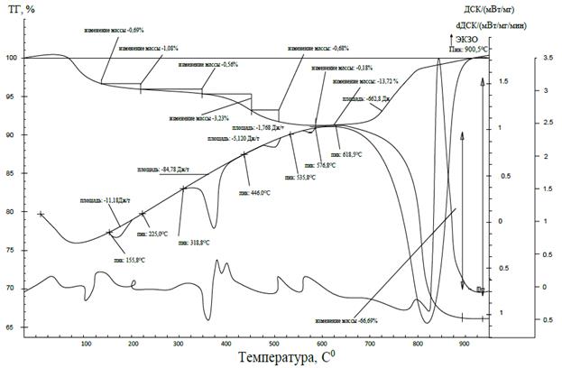 Кривая DSC: эта кривая показывает изменения теплового потока, которые представляют собой экзо- или эндотермические процессы. Потеря массы образца МПСП в интервале температур 100-200°C объясняется потерей молекулы воды в дигидратном гипсе. В ходе процесса анализа при повышении температуры выше 350°С масса образца снова изменилась, что объясняется термической диссоциацией гидроксидов кальция и магния. Наибольшое изменение массы образца наблюдалось при температуре выше 600°C, что объясняется термическим разложением карбоната магния, а после повышения температуры до 900°C произошло термическое разложение карбоната кальция.