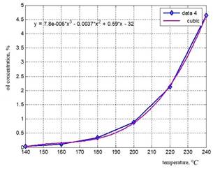 The dependence of the equilibrium concentration of the oil phase processes in the quasi-apparatus of the third stage of the deodorization unit on temperature is shown in Figure 2. It indicates that when the temperature rises to 180°C, the equilibrium concentration increases significantly compared to the initial state.