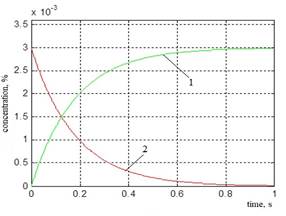 Figure 1 illustrates the time-dependent change in the concentration of light volatile components transitioning to the vapor phase. As seen from the figure, the concentration of light volatile components in the vapor phase initially increases rapidly and intensively. As the process approaches a steady state, the rate of change in concentration slows down.