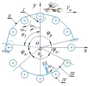 В качестве привода шпинделей вертикально - шпиндельной хлопкоуборочной машины применяетсятся планетарный фрикционный механизм с размыканием кинематической цепи, где шпиндели являются сателлитами [7]. При этом шпиндели, по мере сбора хлопка-сырца дважды меняют направлению вращения за цикл вращения шпиндельного барабана (Рис.1).