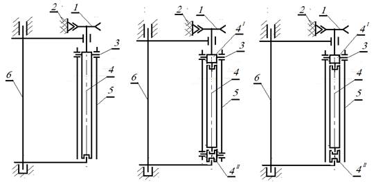 Рисунок 2. Кинематические схемы конструкции оболочковых шпинделей, имеющих дополнительные степени подвижности: 1 – приводной ролик шпинделя; 2 – приводной ремень; 3 – место сопряжения оболочкового захватывающего элемента со стержнем;