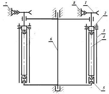 Рисунок 3. Принципиальная кинематическая схема шпиндельного барабана со структурно-свободным стержнем: 1 – приводной ролик; 2 – верхняя часть стержня; 3 – оболочковый захватывающий элемент; 4 – средняя структурно-свободная часть стержня; 5 – нижняя часть стержня; 6 – шпиндельный барабан; 7,8 – ремни прямого и обратного вращений.