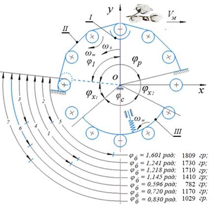 Рисунок 6. Углы поворота шпиндельного барабана до остановки шпинделей различных конструкций после выбега их из рабочей зоны (из сцепления с ремнями привода): I-шпиндельный барабан; II- ремень прямого вращения; III- ремень обратного вращения. Шпиндели: 1-оболочковый с цельным стержнем; 2 - оболочковый со структурно-свободным стержнем; 3 - оболочковый без структурно-свободного стержня; 4 - серийный цельнометаллический; 5 - серийный винтовой; 6 - рекомендуемый облегченный оболочковый; 7 - оболочковый с крестообразным стержнем.