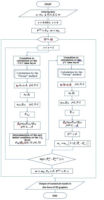 Based on the numerical model developed above, the two-dimensional boundary-value problem of gas filtration in a porous medium is reduced to two finite-difference problems (in the x and y directions) using the alternating direction scheme, and is solved by the sweep method (tridiagonal matrix algorithm) [9, 10]. In each direction, i.e., within a half-time layer, the pressure function is computed iteratively.