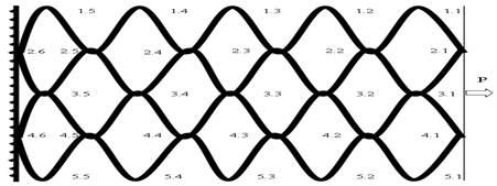 Рассмотрим состояние образца на рис. 3, при этом внешняя сила P равномерно распределяется на узлы образца 2.1 и 4.1. В результате этого, на узлы 2.1 и 4.1 действуют внешние силы