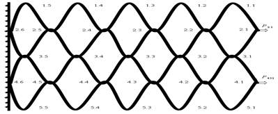 Величина предельных сил, действующих на нити, которые составляют 2 ряда узлов образца трикотажного полотна (рис. 1), определяется с помощью уравнений (1) – (18),