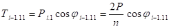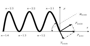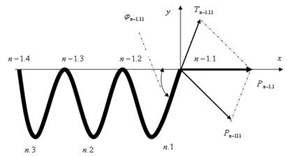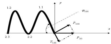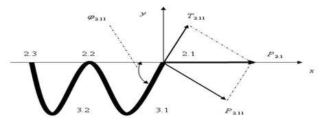 и касательной в точке 2.1 рассматриваемой нити. Вид уравнений изменится как показано ниже: