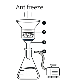 1 – фильтровальная бумага с чёрной лентой (предварительная очистка); 2 – слой базальтовых нитей (удаление мелкодисперсных примесей); 3 – фильтровальная бумага с синей лентой (финишная доочистка); 4 – вакуумный насос (ускорение процесса фильтрации)