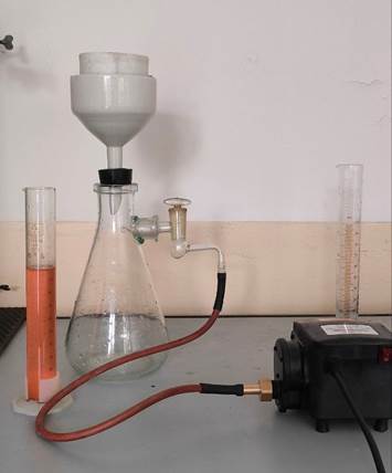 Процесс очистки начинался с загрузки отработанной охлаждающей жидкости в воронку Бюхнера, оснащённую трёхступенчатой фильтрационной системой. На первом этапе использовалась фильтровальная бумага с чёрной маркировочной лентой, предназначенная для грубой механической очистки и удаления крупных частиц. Второй этап предусматривал прохождение жидкости через слой базальтовых нитей, которые не только задерживали мелкодисперсные примеси, но и частично адсорбировали органические соединения и продукты разложения. На заключительной стадии применялся нижний фильтр с синей маркировочной лентой, обеспечивающий тонкую очистку от мельчайших взвешенных частиц. Для повышения скорости фильтрации и увеличения эффективности процесса использовался вакуумный насос, создающий разрежение и способствующий ускоренному прохождению жидкости через все фильтрационные ступени. Реализация данной схемы позволила достичь высокой степени очистки антифриза, обеспечив его повторное использование и снижение экологической нагрузки.