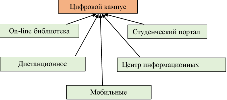Компоненты цифрового университета. Цифровой кампус – это образовательно-ориентированная социальная среда, необходимая для организации эффективного образовательного процесса. Эта сеть содержит всю структуру университета и все онлайн-сервисы, необходимые для успешного обучения (Рисунок 2).