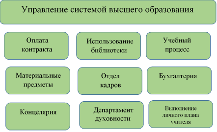 Автоматизация управленческих процессов в сфере образования с помощью информационных систем, избегая излишней бюрократии, также внесла определенный вклад в развитие образования и науки. Применение механизмов искусственного интеллекта через информационные системы в управлении образованием создает возможность анализа процесса повышения интеллектуального потенциала обучающегося. В системе высшего образования автоматизация управленческих процессов следующих подразделений служит повышению эффективности работы. Для реализации концепции университета необходимо будет внедрить механизмы, представленные на следующей схеме (рисунок 1).
