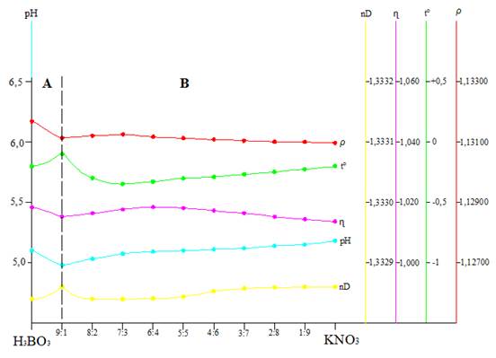 Результаты зависимости изменения физико-химических свойств растворов от соотношения компонентов в системе H3BO3 и KNO3 представлены в таблице 1 и на рисунке 1.