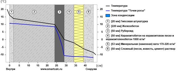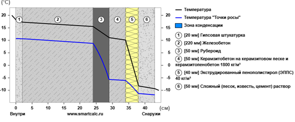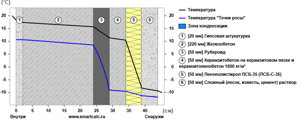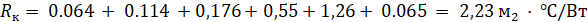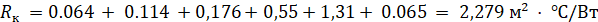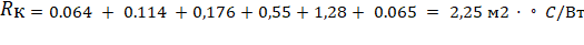 Rк = R Гипсовая штукатурка +Rж.б.плита+ R рубероид + R керамзит +R Цементная стяжка = 0.064 + 0.114 +0,176+0,55+ 0.065 = 0.969 м2 · ◦C/Вт