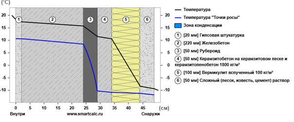 При использовании в качестве теплоизоляции для крыши следующих материалов - вермикулита, экструдированного пенополистирола (ЭППС) плотностью 40 кг/м³, пенополистирола ПСБ-35 и минеральной ваты - в программе SmartCalc были получены следующие результаты.