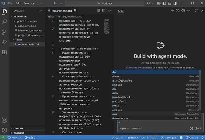 Эксперимент проводился в среде Visual Studio Code с использованием агента GitHub Copilot. Подобного рода инструменты выбраны благодаря своей универсальности: они поддерживают различные языки программирования, а также позволяют работать со скриптами и конфигурационными файлами инфраструктуры. В качестве примера рассматривалось проектирование приложения для оформления онлайн-ипотеки по методологии Domain-Driven-Design (DDD) [2], а также создание необходимой инфраструктуры для запуска приложения в разных средах и организации мониторинга. Для воспроизводимости эксперимента использовалась методика с заранее заготовленными промптами, хранящимися в директории .github/prompts. Это позволяло вызывать их в агенте как команды.