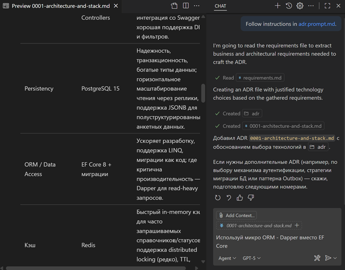 Агент анализирует файл с требованиями и генерирует документ архитектурных решений (Architecture Decision Record, ADR) – артефакт, фиксирующий архитектурные решения с обоснованием выбора технологий. Результат показан на рисунке 2.
