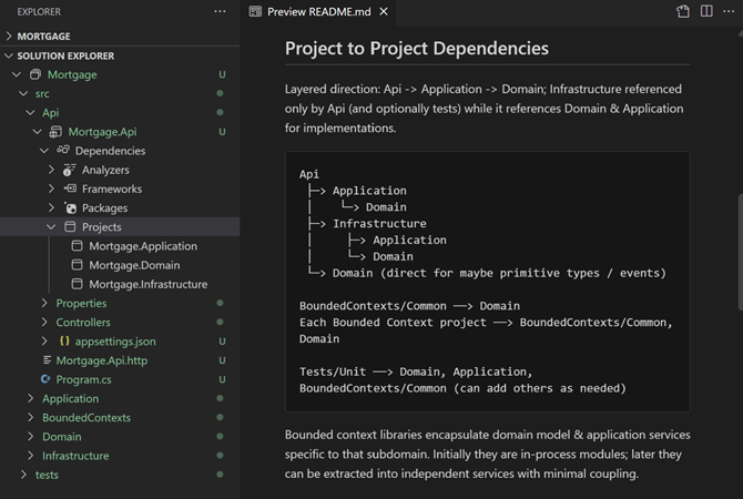 Рисунок 3. Сгенерированная структура проекта и файл README.md с описанием зависимостей между слоями