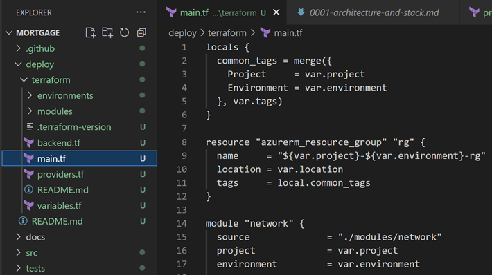 Рисунок 4. Сгенерированные файлы Terraform на основе промпта infra-deploy.prompt.md для описания инфраструктуры и автоматизированного деплоя приложения