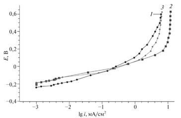 Анодные поляризационные кривые в 3%-ном растворе NaCl регистрировали в потенциостатическом режиме с применением потенциостата ПИ-50-1 и программного устройства ПР-8. Линейные участки поляризационных кривых экстраполировали к значению стационарного потенциала, что позволило определить скорость коррозии.