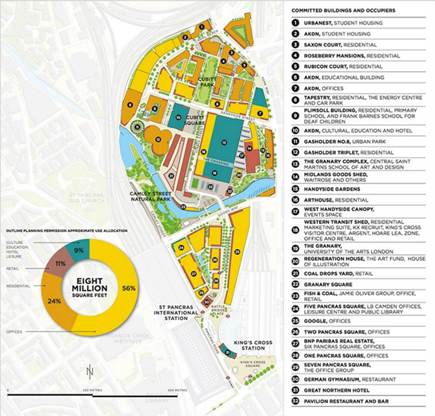 В рамках программы модернизации района станции Кингс-Кросс запланировано создание новой инфраструктуры на площади 27 гектаров в центре Лондона, в том месте, где ранее находились железнодорожные пути к северу от станций Кингс-Кросс и Сент-Панкрас. Теперь, согласно проекту, эта территория будет использоваться в смешанном формате. Благодаря этой одной из крупнейших в Европе программ модернизации на реконструируемые территории и во вновь возводимые объекты удалось привлечь ряд крупных арендаторов, и преобразовать заброшенную часть Лондона в динамично развивающийся район.