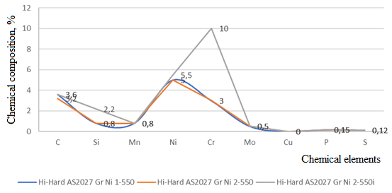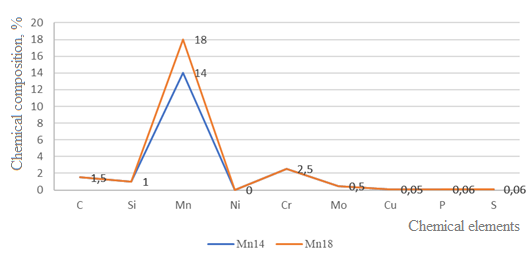The following figures show the hardness indicators and chemical compositions of metals used for spare parts and coatings of grinding mills at processing plants in the mining industry.