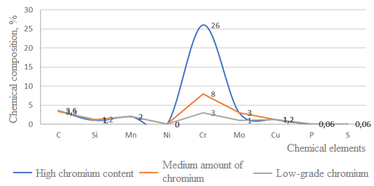 Chromium alloy cast irons are divided into high, medium, and low chromium alloy cast irons. The microhardness of materials with such composition is HV1300-1800, and the resistance of ball mills to impacts and destruction is high. The graph of the dependence of the material is shown in Figure 2 below.