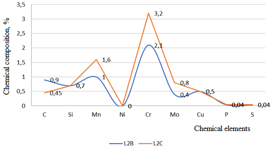 The microstructure of the chromium-molybdenum alloyed coating material is pearlitic and martensitic, with a hardness of HB 325-400. Coatings of this type are resistant to impact and destruction under the action of load forces on the surface layer. The graph of the dependence of the material is shown in Figure 3 below.