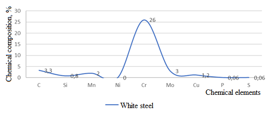 White steel is used for small impact interactions. The microstructure consists of martensite, carbide, and austenite, and the chemical dependence of the material is shown in Figure 5 below.