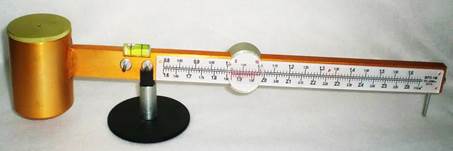 The shoulder scales used to determine the density of light drilling fluids (Figure 1) consist of a base, a pointed stand, a graduated lever, a measuring cup, a lid, supports, a level with an air bubble, and a rider. The measuring cup is fixed to one end of the graduated lever. The cup and lever lie in a plane perpendicular to the plane of the pointed base at the end of the base, and are aligned by moving the rider along the lever.