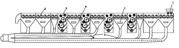 1-питающий валик; 2-1ХК (колковый очиститель); 3-пильчатая секция УXK; 4- бункер для сора; 5- труба для сора; 6- магистральная труба для подачи сора; 7- окно контроля. 8- ленточный транспортёр; 9- пневматическая труба;