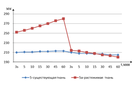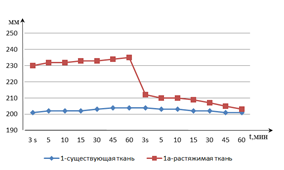 Как видно из графиков, обратимая и необратимая деформация эластичных авровых полотен, изготовленных авторским коллективом, показала более высокие качества, а растяжимость увеличилась на 33 %