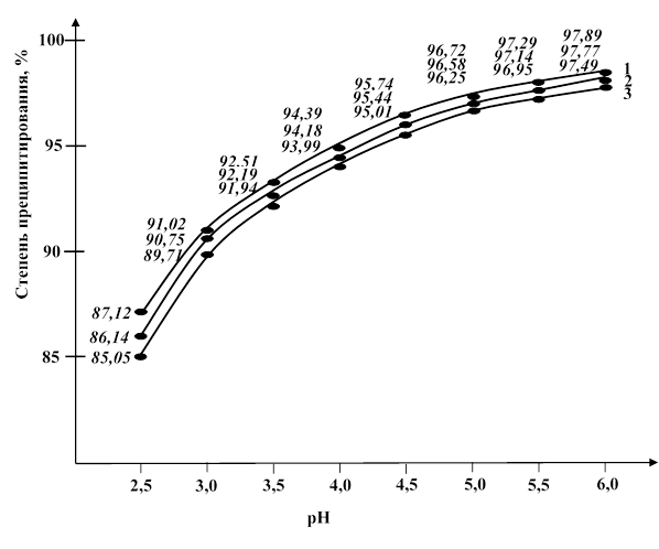 Относительные значения части усвояемой растением оксида фосфора (V) из полученных удобрений ((Р2О5усв./Р2О5общ..)·100%) снижаются в значительной степени. Например, при концентрации кислоты 45 % и рН среды 2,5 относительная значения P2O5усв. составляет 98,27 %, при рН 3,0 – 94,97 %, при рН 3,5 – 92,98 %, при рН 4,0 –90,05 %, при рН 4,5 – 87,21 %, при рН 5,0 – 84,44 %, при рН 5,5 – 79,92 % и при рН 6,0 – 76,00 %. Эти данные показывают, что с увеличением рН среды содержание P2O5усв. уменьшается, что связано с последовательным протеканием химических реакций: 2Н3РО4+Са(ОН)2=Са(Н2РО4)2+2Н2О; Са(Н2РО4)2+Са(ОН)2=2СаНРО4+2Н2О и 2СаНРО4+Са(ОН)2=Са3(РО4)2+2Н2О. За счет образования Са3(РО4)2 снижаются доля усвояемой формы фосфора (P2O5). Из данных рисунка 2 также видно, что изменения концентрации кислоты не оказывают значительного влияния на эти величины. В случае, полученных веществ на основе ФМ в пределах оптимальных значений рН основной химический состав прецепитатов имеет следующий состав (масс.%): Р2О5общ. = 25,01–25,98; Р2О5усв. (ЛК) = 20,69–21,28; СаОобщ. = 25,76–29,39; СаОусв. ЛК = 21,74–23,28; СаОводн. = 1,15–1,36 и N = 0,43–0,57. Как и в случае с ММ, наблюдаются аналогичные закономерности, однако в прецепитатах, полученных из ФМ, содержание Р2О5общ. оказывается выше. Это свидетельствует о том, что при использовании более качественного фосфатного сырья можно получить удобрения с более высоким содержанием питательных компонентов (P2O5), которое непосредственно влияет на конечный состав удобрений и их эффективность для растений.