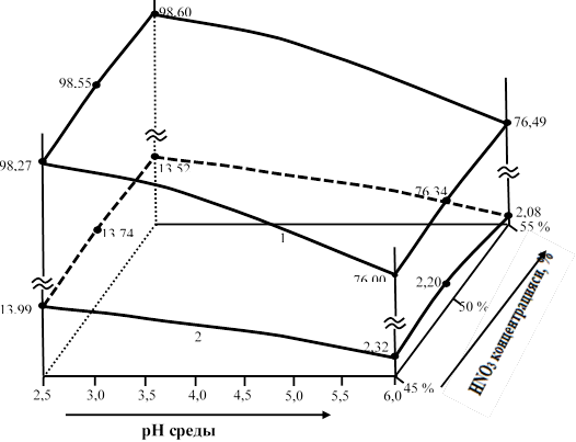 Рисунок 2. Влияние pH раствора и концентрации азотной кислоты на (P2O5усв./P2O5общ.)·100% (1) и перехода Р2О5 в раствор (2) в образцах преципитатов