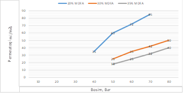 На рисунке выше изучено влияние давления на поток пермеата под действием смеси ионов раствора метилдиэтаноламина различных концентраций (20–35 %). Когда метилдиэтаноламин переносится через мембрану в концентрациях раствора, поток пермеата увеличивается с увеличением давления. Это показывает, что движущей силой процесса пермеации через мембрану является градиент давления. Следовательно, увеличение приложенного давления увеличивает поток пермеата. Как правило, рабочее давление процессов фильтрации алконоламинов в процессе очистки газов обычно находится в диапазоне 5–25 бар. Однако в данном исследовании высокое рабочее давление объясняется повышением осмотического давления высокой концентрации (20–35 %) раствора метилдиэтаноламина. По этой причине устанавливается дополнительный насос для повышения давления, а используемый раствор метилдиэтаноламина изготовлен из мембранного войлока, содержащего PVDF/PSU/PAN/PEG, в диапазоне давлений 10–80 бар.