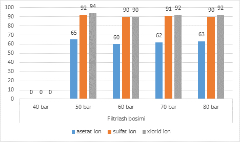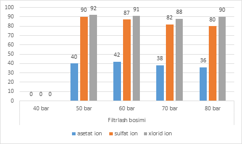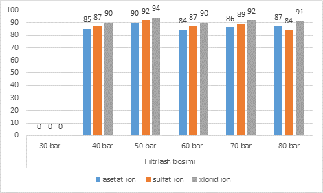 20 %, 30 % и 35 % растворы переносились с использованием первого типа 1PVDF/PSU/PAN/PEG композитного мембранного фильтра. Следующие ионы, образующие термически стабильные соли при давлении 50 бар: ацетатные, сульфатные и хлоридные ионы удерживаются в фильтре с максимальной эффективностью. В результате было обнаружено, что 90 % ацетат-ионов, 92 % сульфат-ионов и 94 % хлорид-ионов остаются в фильтре, когда 20 % использованного раствора МДЭА подвергается воздействию давления 50 бар.