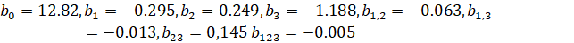 При сравнении с коэффициентами уравнения регрессии установлено, что все коэффициенты, кроме b₁₂, b₁₃, b₁₂₃, по абсолютной величине больше 0.074.