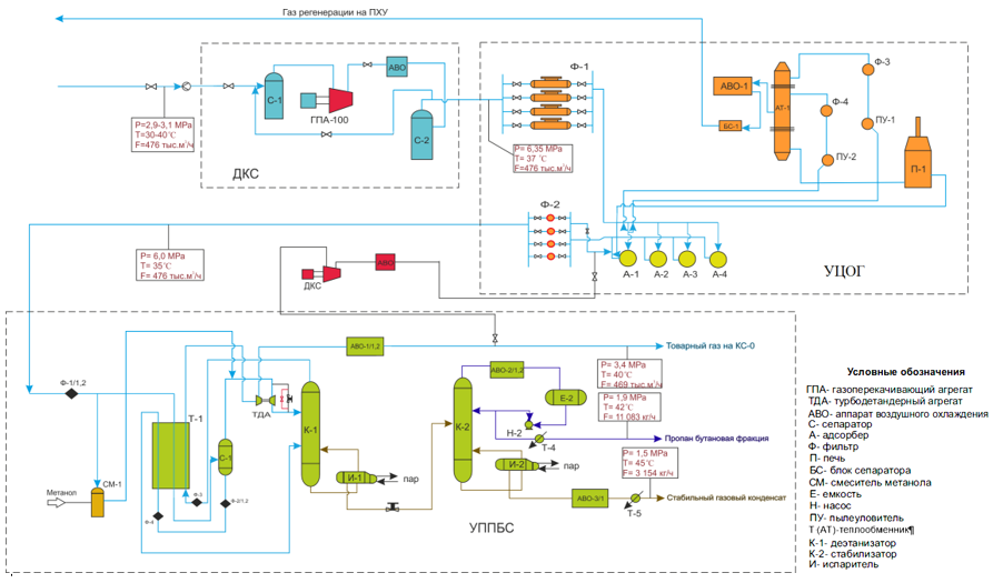 Разработаны технологические решения, включающие: повышение качества подготовки газа аминовой сероочистки и НТС на входе ДКС (по точке росы и содержанию мехпримесей); перераспределение газовых потоков для увеличения объема газа, подаваемого на УППБС-1,2,3; обеспечение необходимого режима разделения потоков на колоннах деэтанизации и стабилизации; улучшение качества очистки от механических примесей на выходе газа после цеолитовой осушки и др.