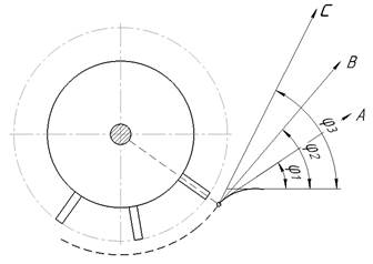 Волокна шерсти движутся по траекториям A, B, S на поверхности гребенки, образуя углы α1, α2, α3. При угле схода α = 0 движение волокон должно быть горизонтальным. Для более тщательной очистки волокон шерсти и отделения посторонних примесей из их состава необходимо увеличить время и расстояние их движения по поверхности гребенки, а также направить их под определенным углом [5].