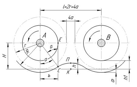 Метод и методология исследования. Рассчитываем основные показатели колковых барабанов и угол удара сырья для двухворсового барабана. Схема очистительно-разрыхлительного барабана имеет гребенчатую поверхность [3]. При постоянстве Ɩ, R, r — необходимо найти угол движения сырья λ, координаты начальной точки C, b, H, а также обосновать высоту h приподнятой части поверхности гребенки между двумя соседними барабанами относительно начальной точки C.