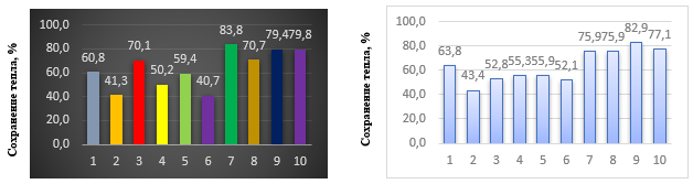 Из полученных данных следует, что при тепловом воздействии с лицевой стороны наивысший показатель теплосохранения продемонстрировал материал образца № 4, значение которого составило 83,8 %. При воздействии теплового потока со стороны изнанки наибольшая теплозащитная способность была зафиксирована у материала образца № 5, с показателем 82,9 %.