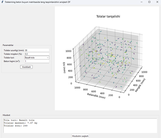 Using this program, it is possible to observe the spatial arrangement of fibers in a concrete sample not only theoretically, but also graphically. The number, density and orientation of fibers are visually depicted using a 3D graph. The program allows the user to create a model that is suitable for real conditions by entering any concrete dimensions, fiber parameters and percentages. This is very useful in preparing for laboratory tests, assessing the strength of structures and designing new composite materials. The program also allows for comparison with experimental results to validate the model. The fact that the distribution of fibers in the volume of concrete corresponds to experimental observations makes it possible to use it as a reliable tool. The program interface is simple and understandable, and in the future it can be improved and turned into an application with a more user-friendly graphical interface. The developed program can serve as a convenient platform for scientific research, and can be effectively used in virtual experiments and design work.