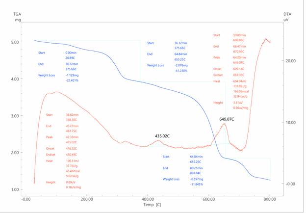 Для фталоцианина с обработанной поверхностью, представленного на рисунке 1, была выбрана максимальная температура 800°C, и результаты анализа пигмента были изучены на основе дифференциальной термогравиметрической (ДТА) и термогравиметрической (ТГА) дериватограмм. При температурах 435.02°C и 649.07°C наблюдались два эндотермических пика – это максимумы на кривой термического анализа, отражающие процесс поглощения тепла. В эндотермических процессах материал поглощает тепло из внешнего источника, что изменяет его внутреннее энергетическое состояние. Изменение энергетического состояния можно увидеть в таблице 1.