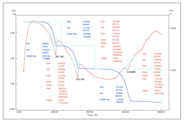 Количество тепла, выделяемого на третьем пике при температуре 610,80 °C, составляет 132,60 мДж (31,70 кал/г), что связано с окислением оставшихся органических и карбонатоподобных структур. Этот термический процесс указывает на полное разложение вещества и образование возможных минеральных остатков (например, CuO).