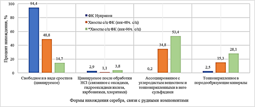 Минералогический состав руд характеризуется присутствием серебра в различных формах: самородное серебро, простые сульфиды и сульфосоли. Значительная часть металла ассоциирована с пиритом, углеродистым веществом и породой. Золото представлено в нескольких формах: свободная форма, сростки с сульфидами и углеродистыми включениями. Цианирование показало, что стандартные методы требуют оптимизации. Выяснилось, что использование окислителей, таких как кислород и перекись водорода, не оказывает существенного влияния на процесс выщелачивания. Для эффективного извлечения серебра необходимо поддерживать время выщелачивания не менее 48 часов и концентрацию цианистого натрия 5 г/л.