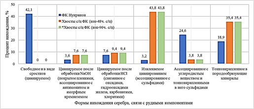 Результаты лабораторных технологических исследований флотоконцентрата на основе рационального анализа флотоконцентрата и кеков цианирования по пробам из флотоконцентрата месторождения Нукракон при различном времени сорбционного цианирования позволил выделить формы нахождения металлов, и его связи с рудными компонентами (рисунки 2 и 3).