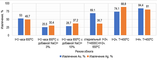 Для изучения эффективности двухстадиального цианирования флотоконцентрата с промежуточным окислительным обжигом проведены серии экспериментов с температурными режимами и условиями обработки. Результаты экспериментов при различных условиях представлены на рисунке 5.