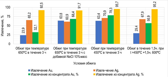 Кислотная обработка флотоконцентратов не дала положительных результатов. При этом окислительный обжиг выявил зависимость эффективности процесса от температуры. Оптимальные показатели достигаются при температуре 450 °C, обеспечивая высокое извлечение как золота, так и серебра.