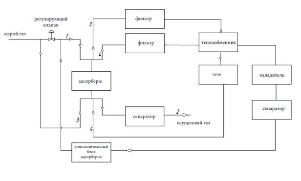 Следующая [3] установка адсорбционной осушки и очистки природного газа после дожимной компрессорной станции перед подачей природного газа в магистральный газопровод включает в себя: циклически повторяющуюся стадию адсорбционной осушки и очистки природного газа, стадию регенерации адсорбента и стадию охлаждения адсорбента, после стадии восполнения адсорбента газ регенерации. Затем его охлаждают в первом блоке адсорбционной осушки и очистки природного газа и направляют во второй дополнительный блок адсорбционной очистки газа регенерации.