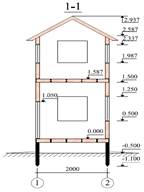 Results and methods. The object of the research is a two-story SIP panel building with dimensions of 1500x2000 mm, modeled at a scale of 1:2. The building's floor heights are 1587 and 1350 mm, and the walls are made of SIP panels (Fig. 1). The sum of the total loads on the first and second floors of this building was Q1=1,72 kN and Q2=0,736 kN. The modulus of elasticity of the SIP panel is E=3500 MPa, and the calculated compression resistance is R=13 MPa [1].